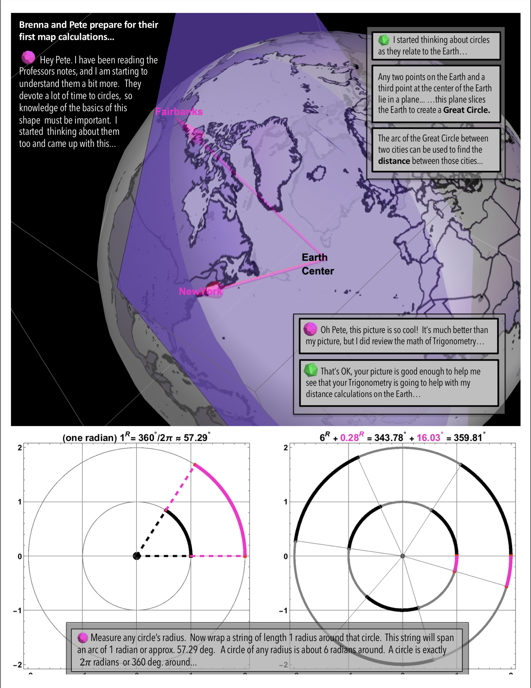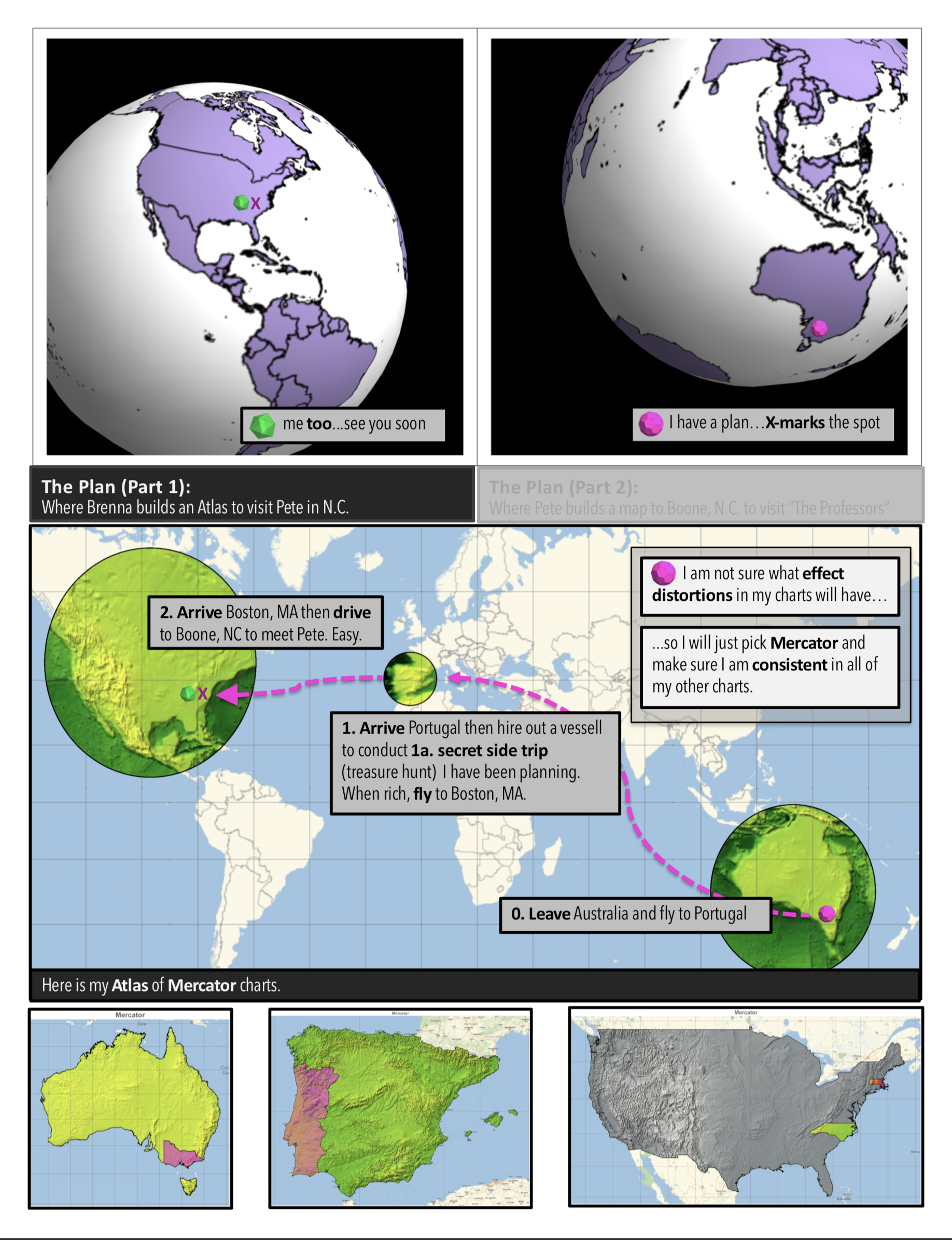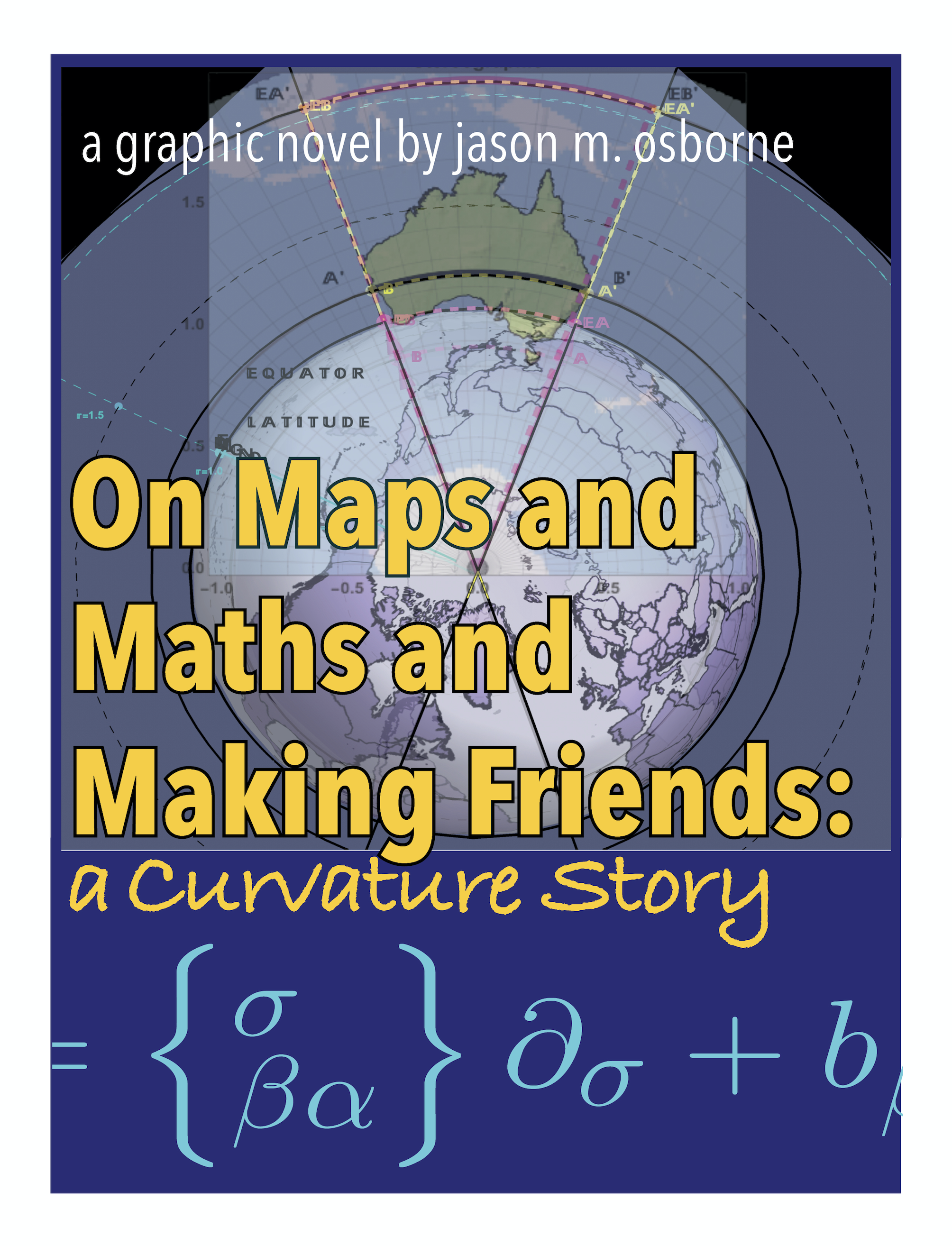 Countless hours tinkering on small projects– which you can peruse throughout this site–have culminated in his first graphic novel On Maps and Math and Making Friends: A Curvature Story which is intended to be an approachable and widely accessible introduction to Mathematics in general and Differential Geometry in particular with a twist of Physics.