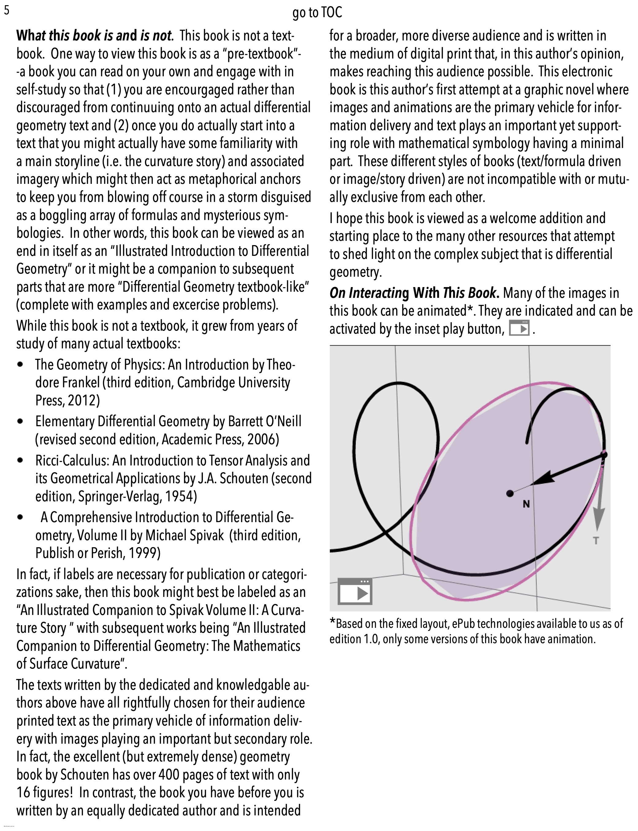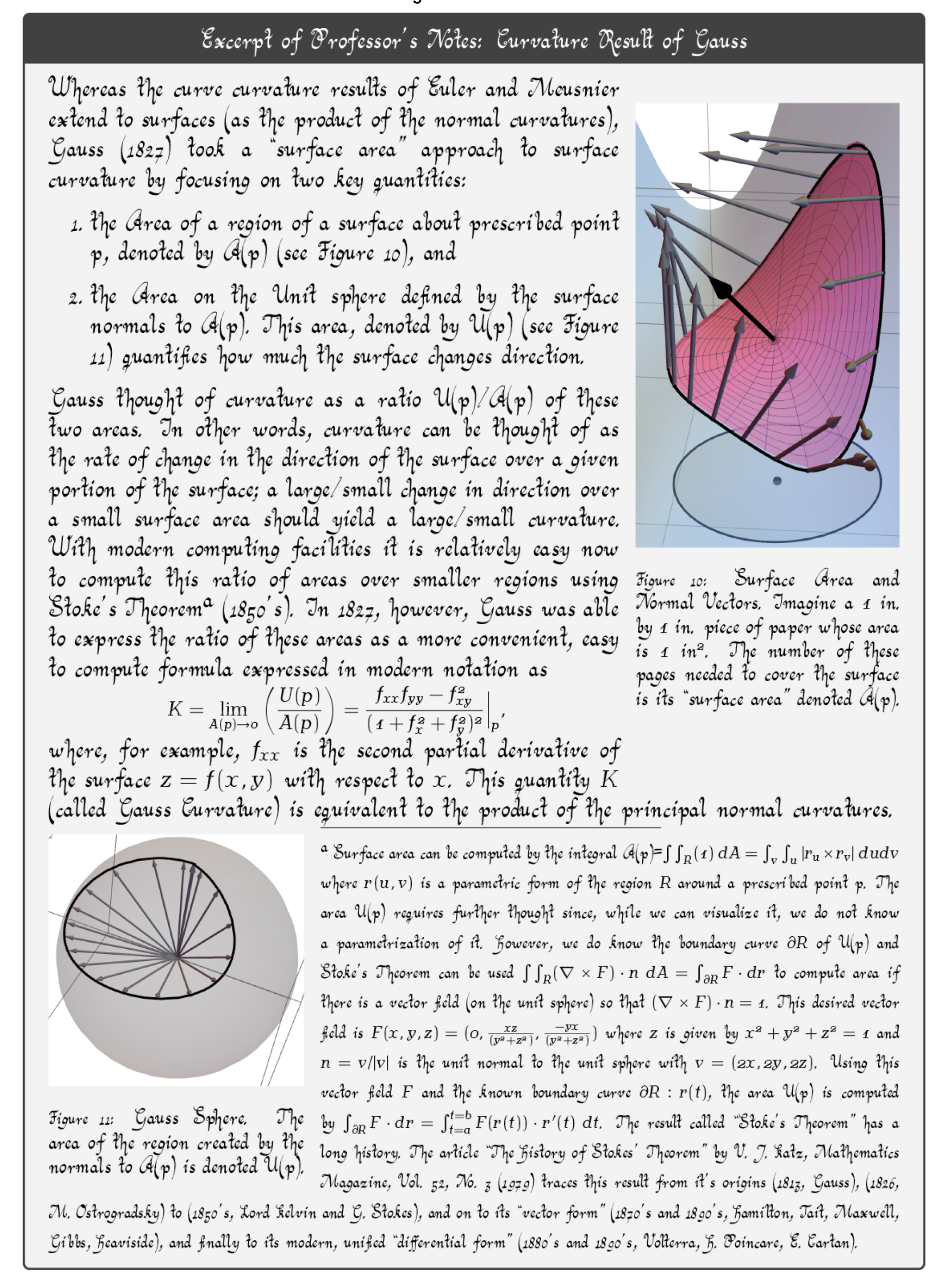 A Curvature Story is a prequel and model for several other similarly interactive works that are in various stages of production (e.g. The Mathematics of Surface Curvature, Variations on a Theme: Differentiation, and The Differential Equations of Differential Geometry, as well as a Calculus text).