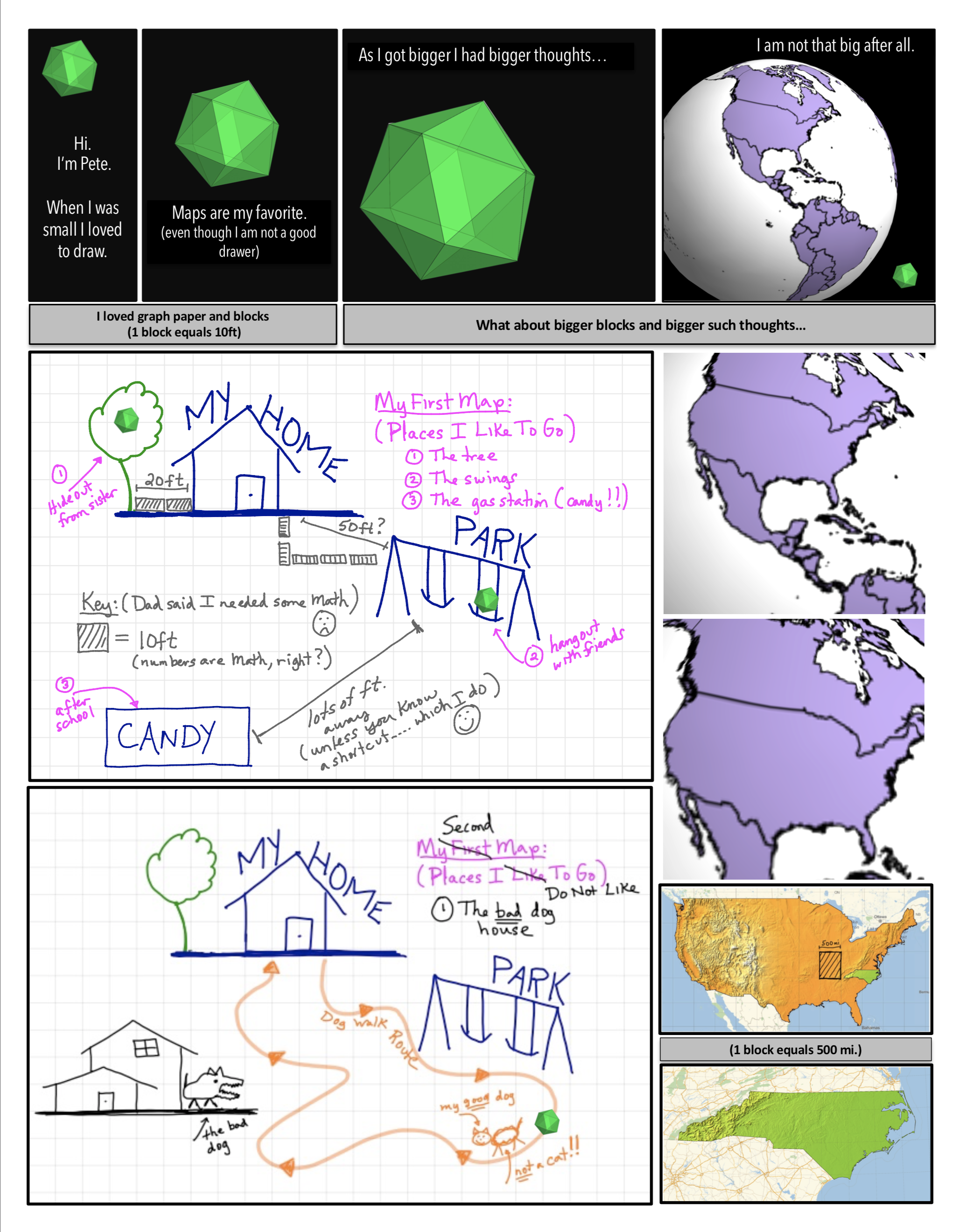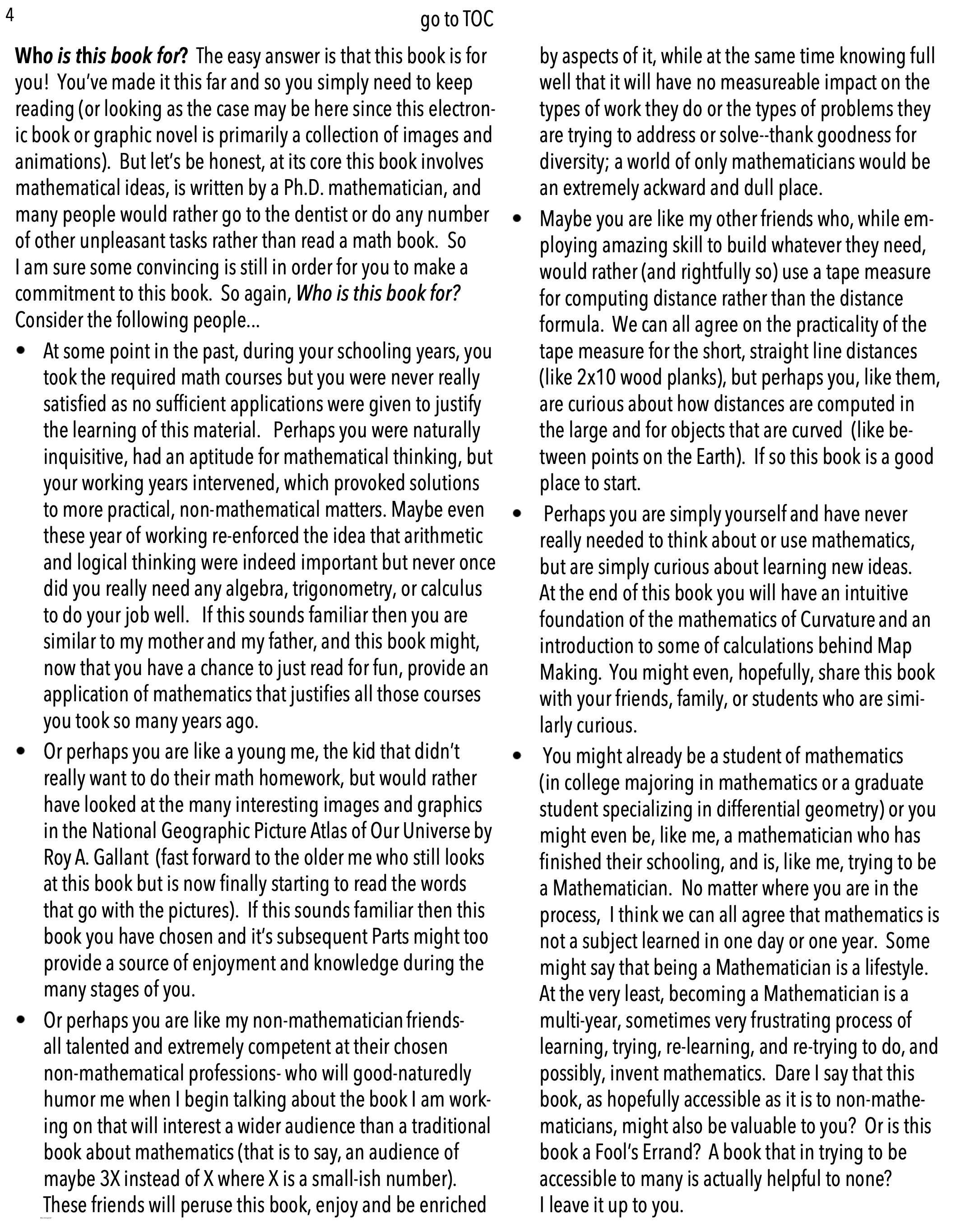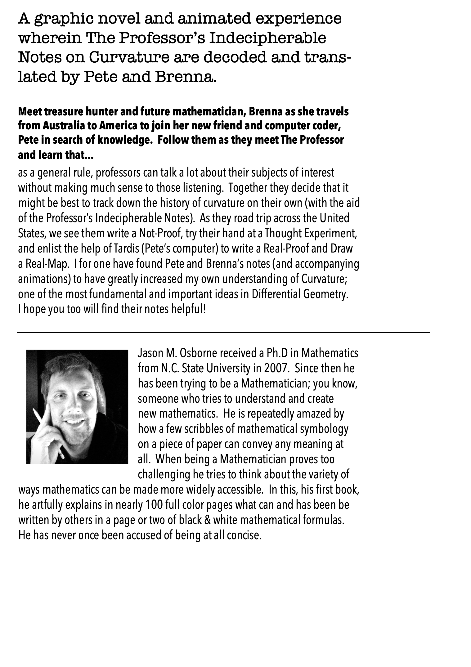 When being a Mathematician proves too challenging he tries to think about the variety of ways he can make mathematics more widely accessible. In his first book, a graphic novel, On Maps and Math and Making Friends: A Curvature Story, he artfully explains in nearly 100 full color, animated pages what can and has been written by others in a page or two of black & white, perfectly stationary mathematical formulas.