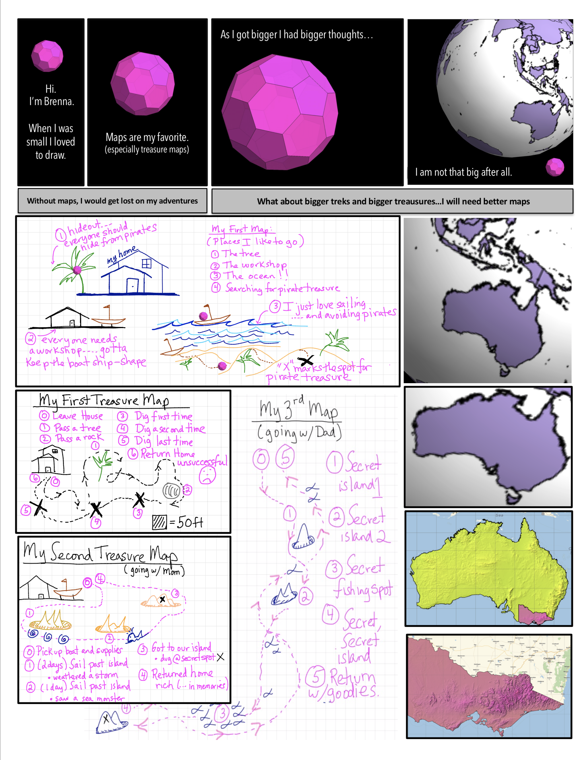 Follow treasure hunter and future mathematician Brenna from Australia to America to meet new friend and coder Pete as they write a Not-Proof, try their hand at a Thought Experiment, and enlist the help of Tardis (Pete’s computer) to write a Real-Proof and Draw a Real-Map. All with the help of the Professor’s Indecipherable Notes.